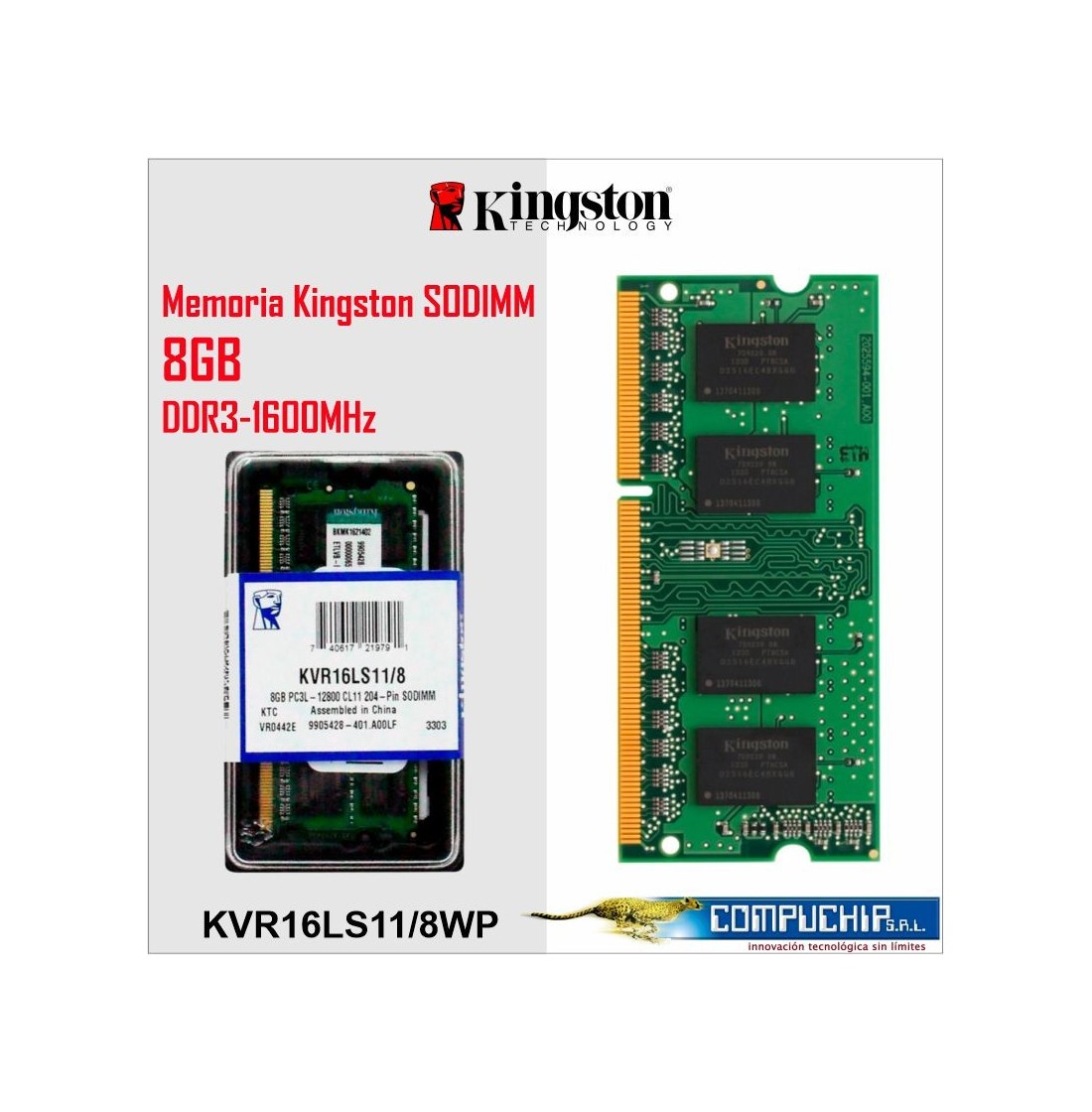 Memoria Kingston KVR16LS11/8WP, 8GB, DDR3L SODIMM, 1600 MHz CL-11, 1.35V