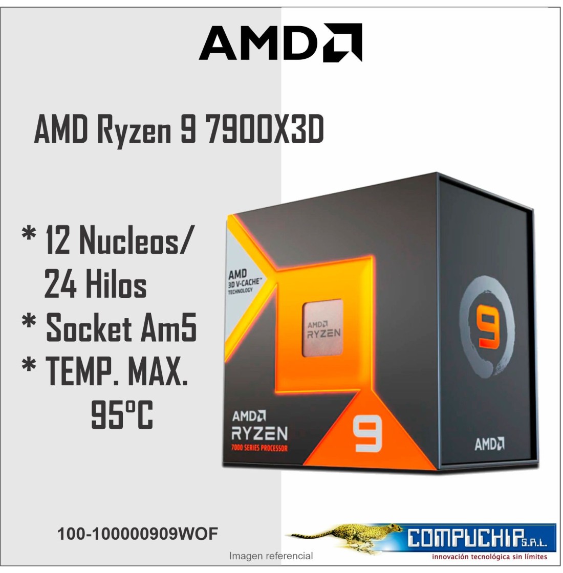 Procesador AMD Ryzen 9 7900X3D 4.4/5.6GHz, 128MB L3, 12-Cores, Socket AM5, 120W.