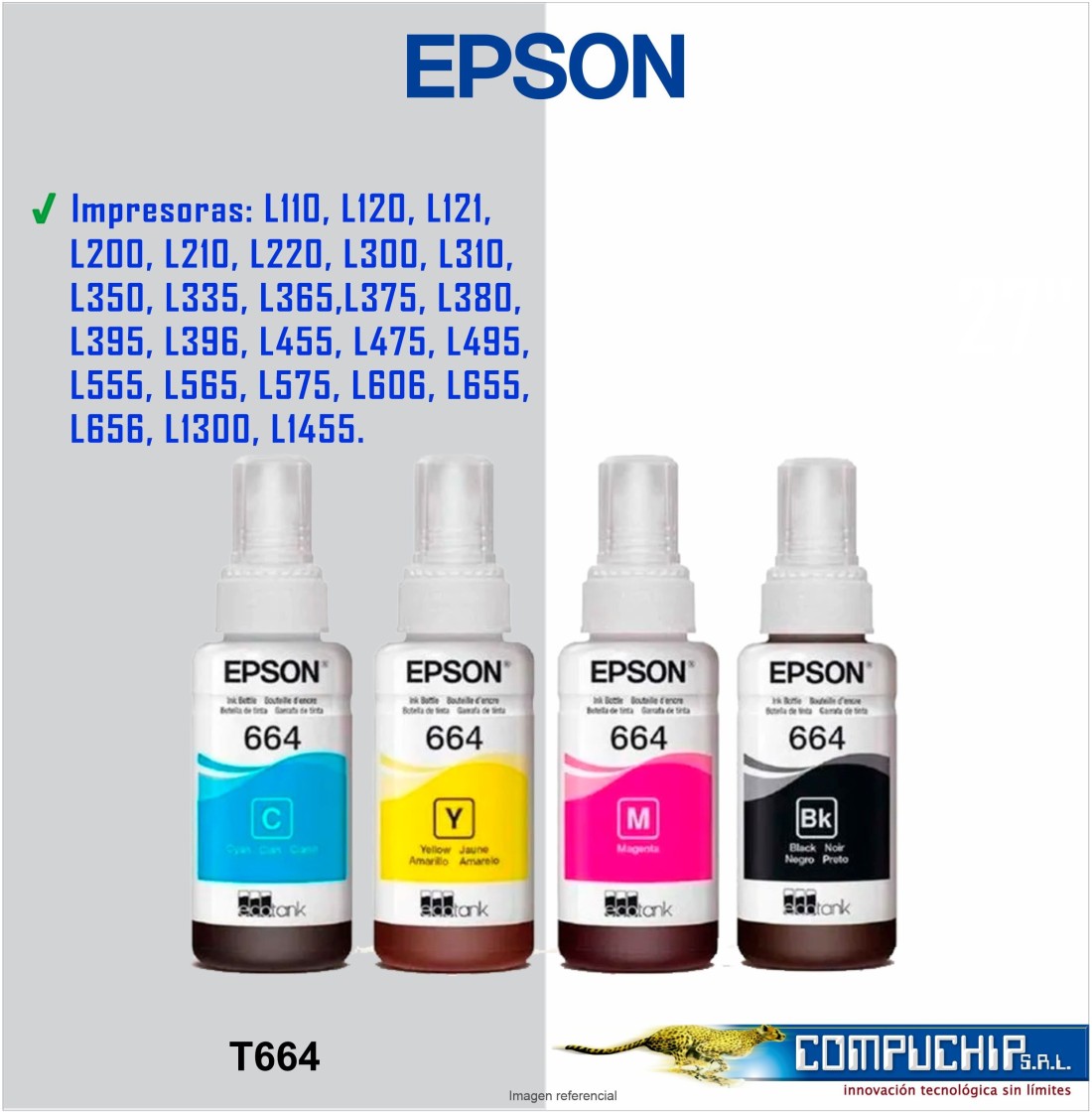 | Compatibilidad | EcoTank L100/ L110/ L120/ L121/ L130 EcoTank L200/ L210/ L220 EcoTank L300/ L310/ L320/ L350/ L355/ L360/ L361/ L365 EcoTank L375/ L380/ L382/ L385/ L386/ L395/ L396 EcoTank L455/ L475/ L480/ L485/ L486/ L495 EcoTank L550/ L555/ L565/ L575 EcoTank L605/ L606/ L655/ L656 EcoTank L1300 / L1400/ L1455 |