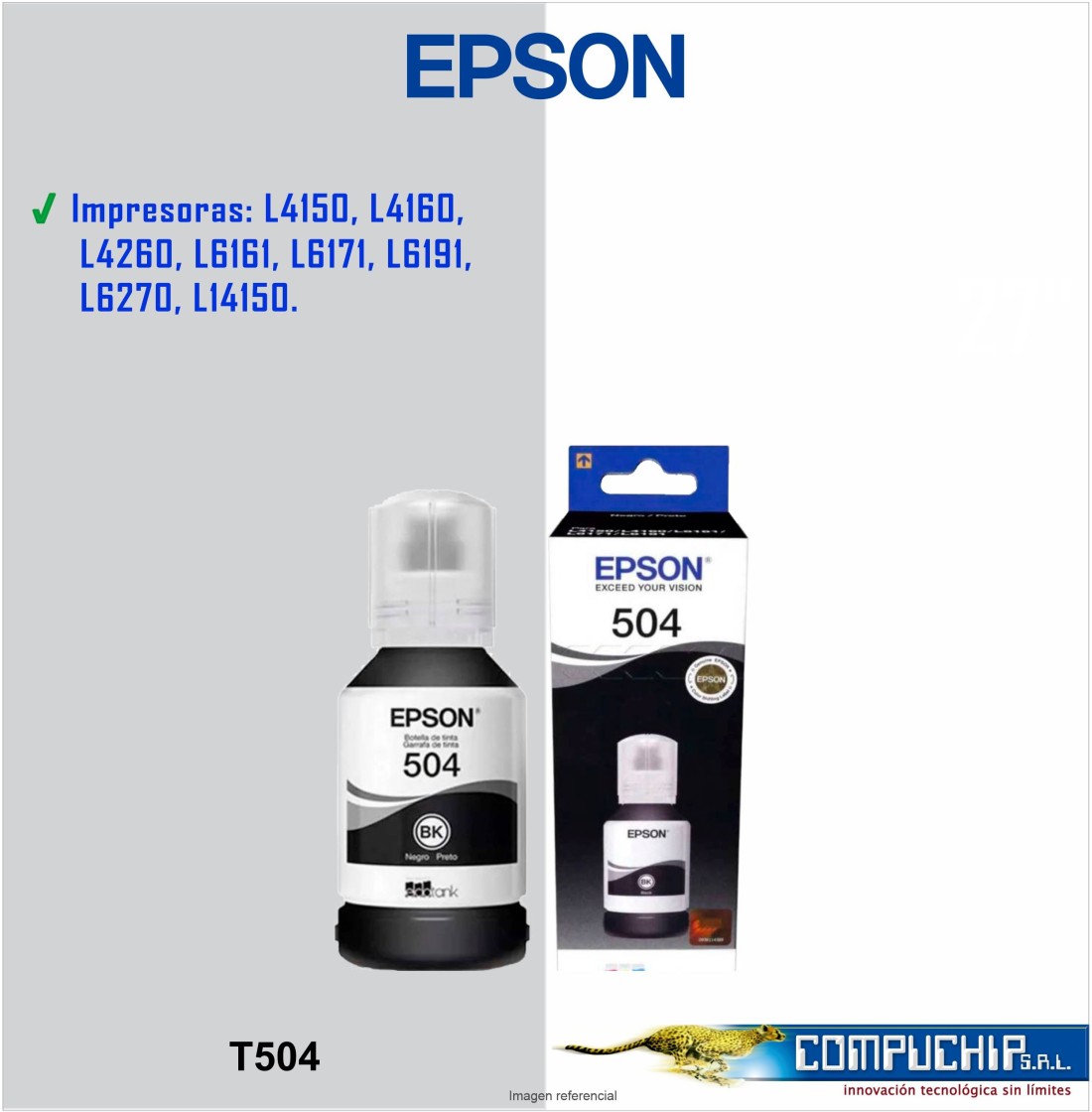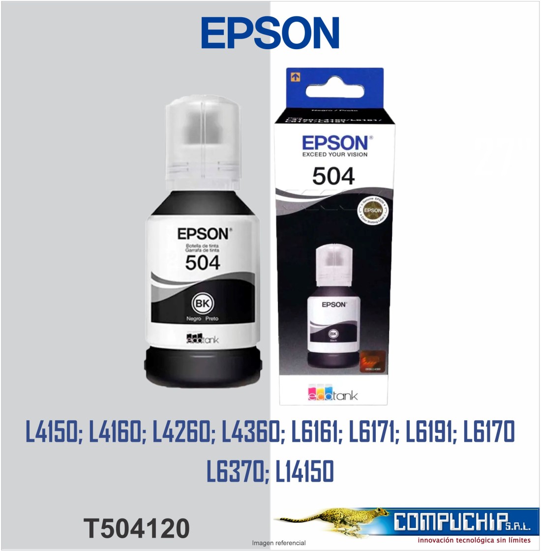 | Compatibilidad | EcoTank L4150/ L4160/ L4260/ L4360 EcoTank L6161/ L6171/ 6191/ L6270/ L6370 EcoTank L14150 (Modelo A3/Oficio) |