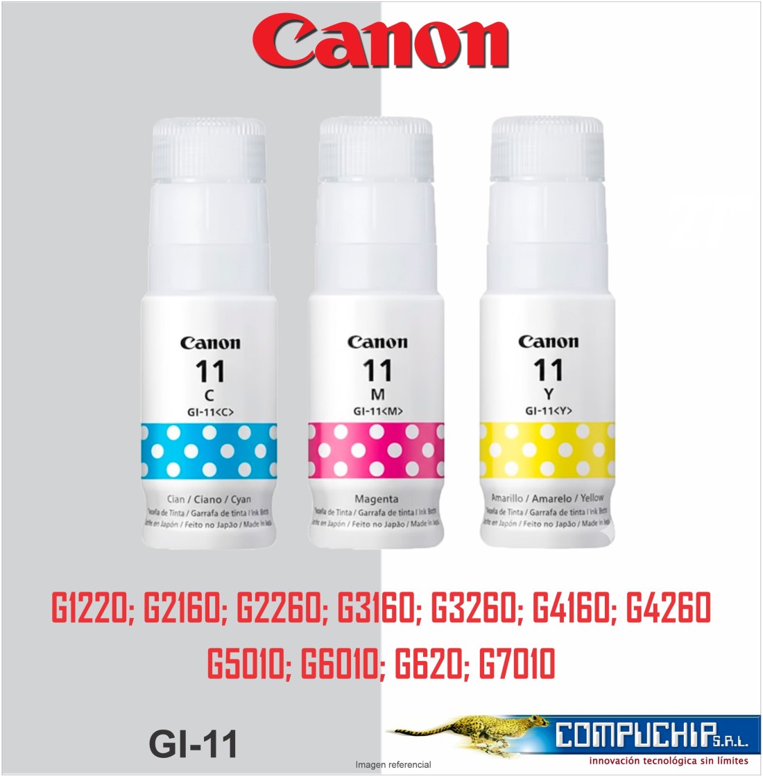 BOTELLA DE TINTA CANON GI-11 COLOR CYAN, MAGENTA, AMARILLO, 70ML.